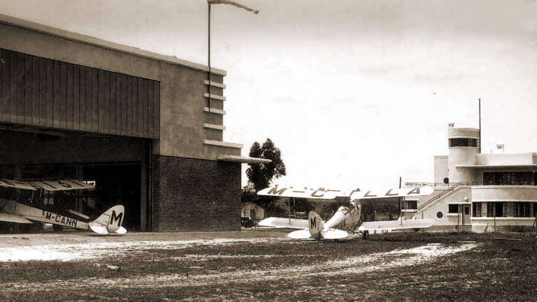 Las obras del aeropuerto se iniciaron en 1929 trás la adquisición de los terrenos, y se inauguró el 30 de abril de 1931, aunque las operaciones comerciales regulares áun tardaron varios años en realizarse. Junto a un edificio destinado a club, se construyeron hangares, garage y taller, además de otro pequeño edificio para sala de espera de viajeros. (…) »